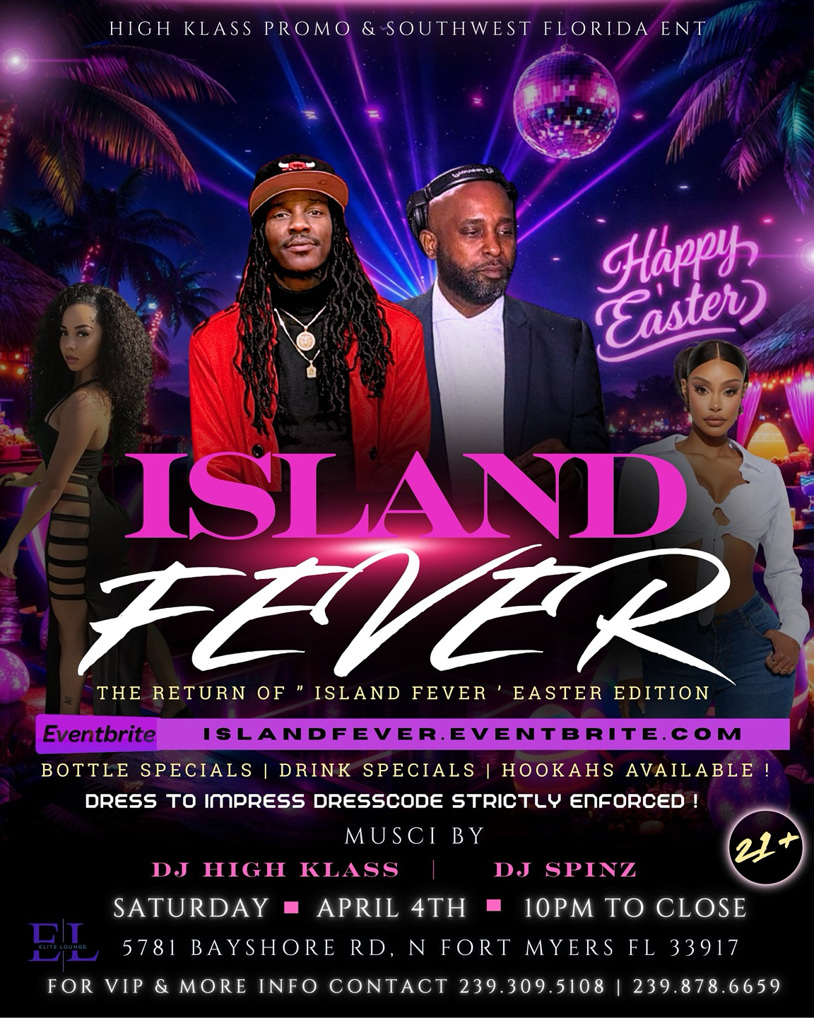 Saturday, April 4th, 2025, Southwest Florida Entertainment presents Island Fever: Easter Edition at Elite Lounge—bringing the best mix of Caribbean, Afrobeats, Hip-Hop, and international sounds in a vibrant, upscale setting. With music by DJ High Klass and DJ Spinz, expect a high-energy crowd and nonstop vibes from 10PM until close, with bottle specials, drink specials, and hookahs available. Dress to impress and secure your spot at islandfever.eventbrite.com—be part of the experience. You won’t want to miss it